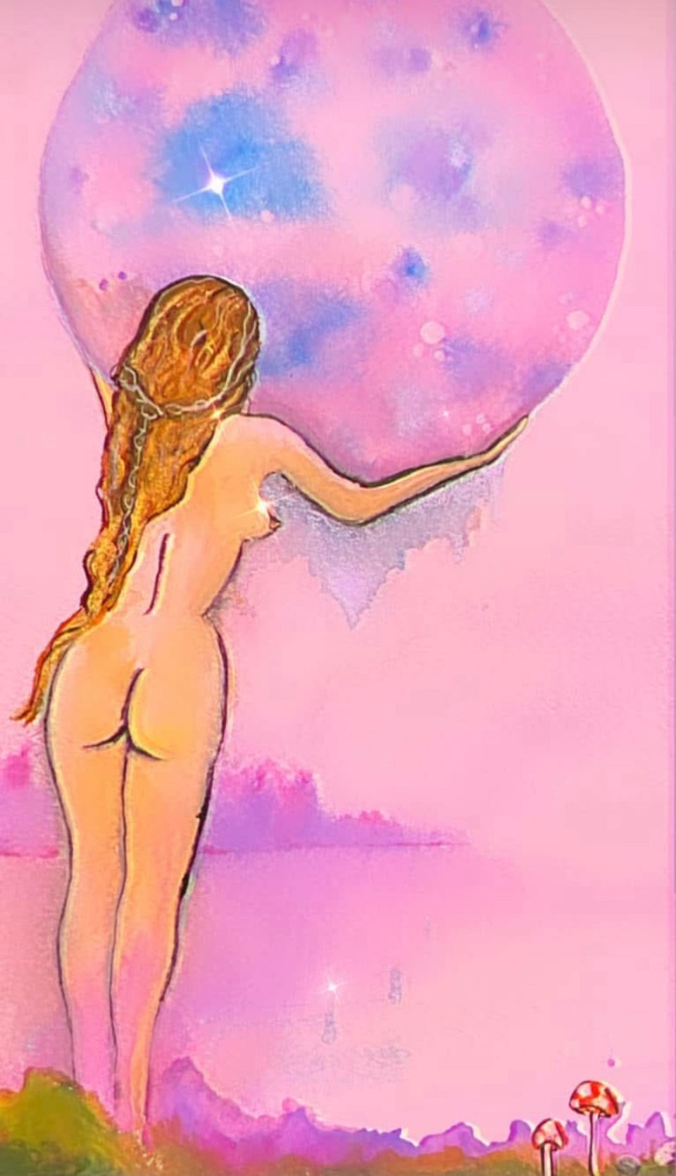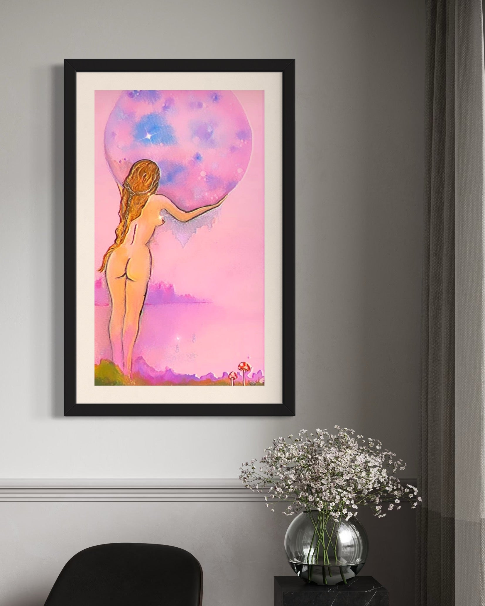 Step into the mystical with “Embrace of the Moon”, a visionary watercolor artwork that captures the intimate connection between the feminine spirit and the cosmos. A nude figure, adorned with flowing braids, reaches tenderly toward a luminous pink-and-indigo moon, symbolizing harmony, surrender, and the eternal bond between humanity and the universe. Dreamlike tones of blush and violet drift across the sky, grounded by earthy greens and whimsical mushrooms below, bringing balance between the ethereal and the earthly.