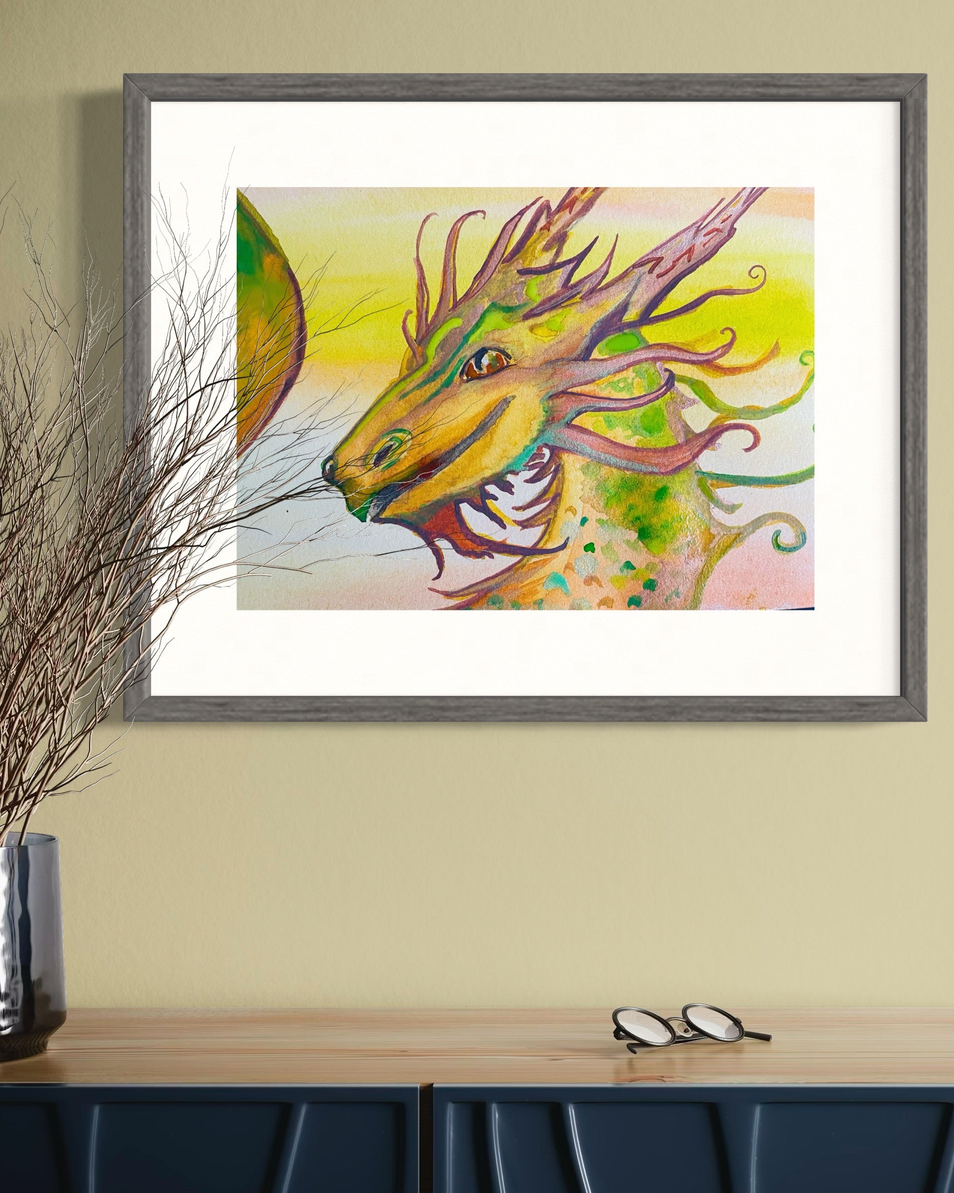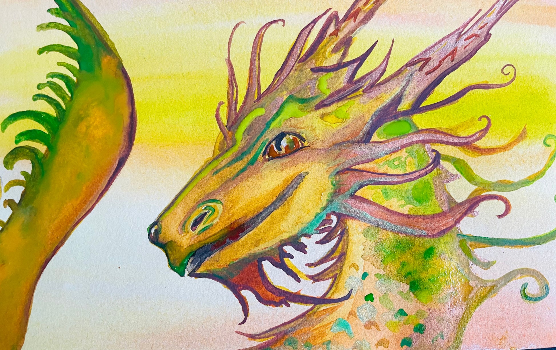 This vibrant watercolor painting brings to life a mythical dragon bathed in the glow of a golden sun. Its scales shimmer with earthy greens and fiery oranges, while twisting, branch-like horns and flowing tendrils give it an otherworldly presence. The dragon’s gaze is both wise and watchful, as though it stands as protector of light, strength, and transformation. 🔥