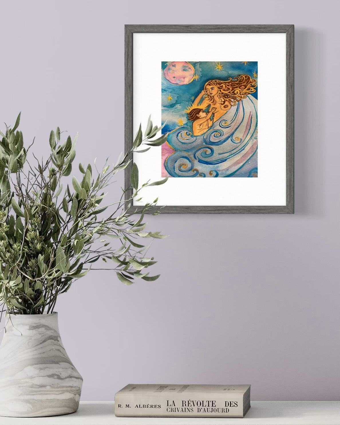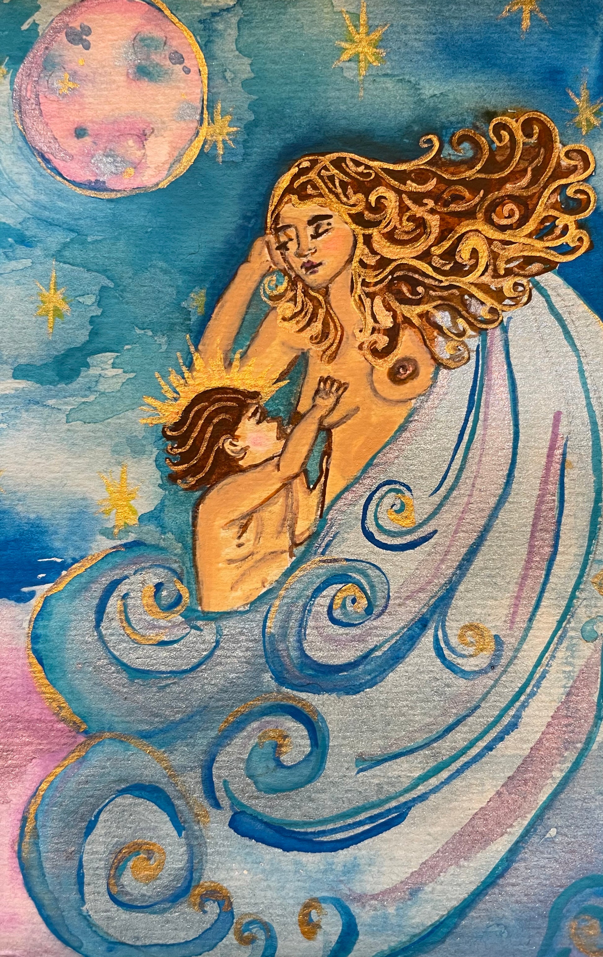 Painted in watercolor, this piece radiates warmth, serenity, and cosmic wonder. It is a celebration of motherhood, divine connection, and the eternal rhythm of creation. Whether placed in a nursery, sacred space, or home gallery, Mother of the Stars invites you to feel both protected and inspired, reminding you that we are all children of the universe.