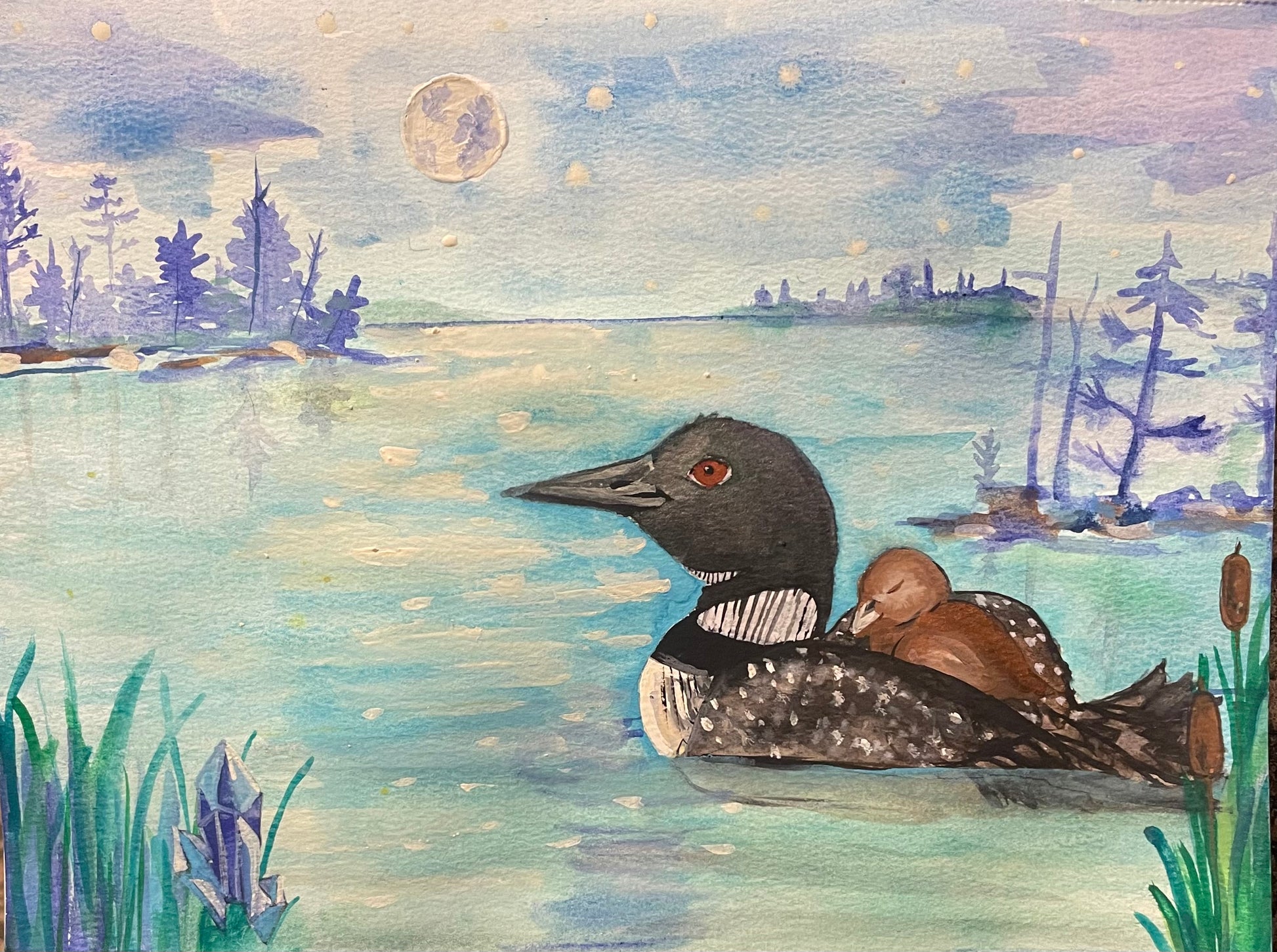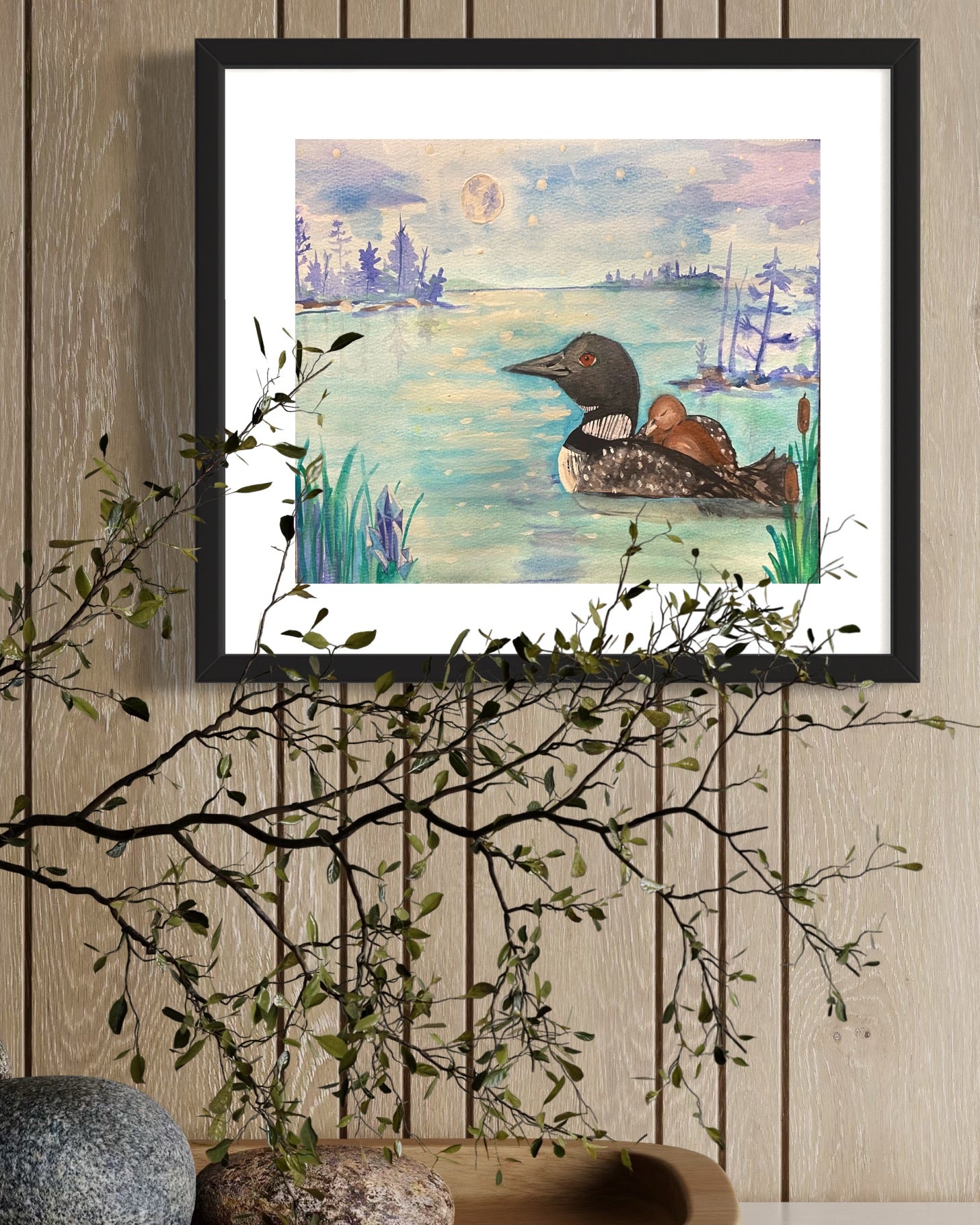 A mother loon glides peacefully across a glowing lake, her chick nestled safely on her back beneath the watchful gaze of the moon. Painted in soft watercolor tones with hints of crystal light and serene reflections, this piece captures the timeless bond of love, protection, and the wild beauty of northern waters.